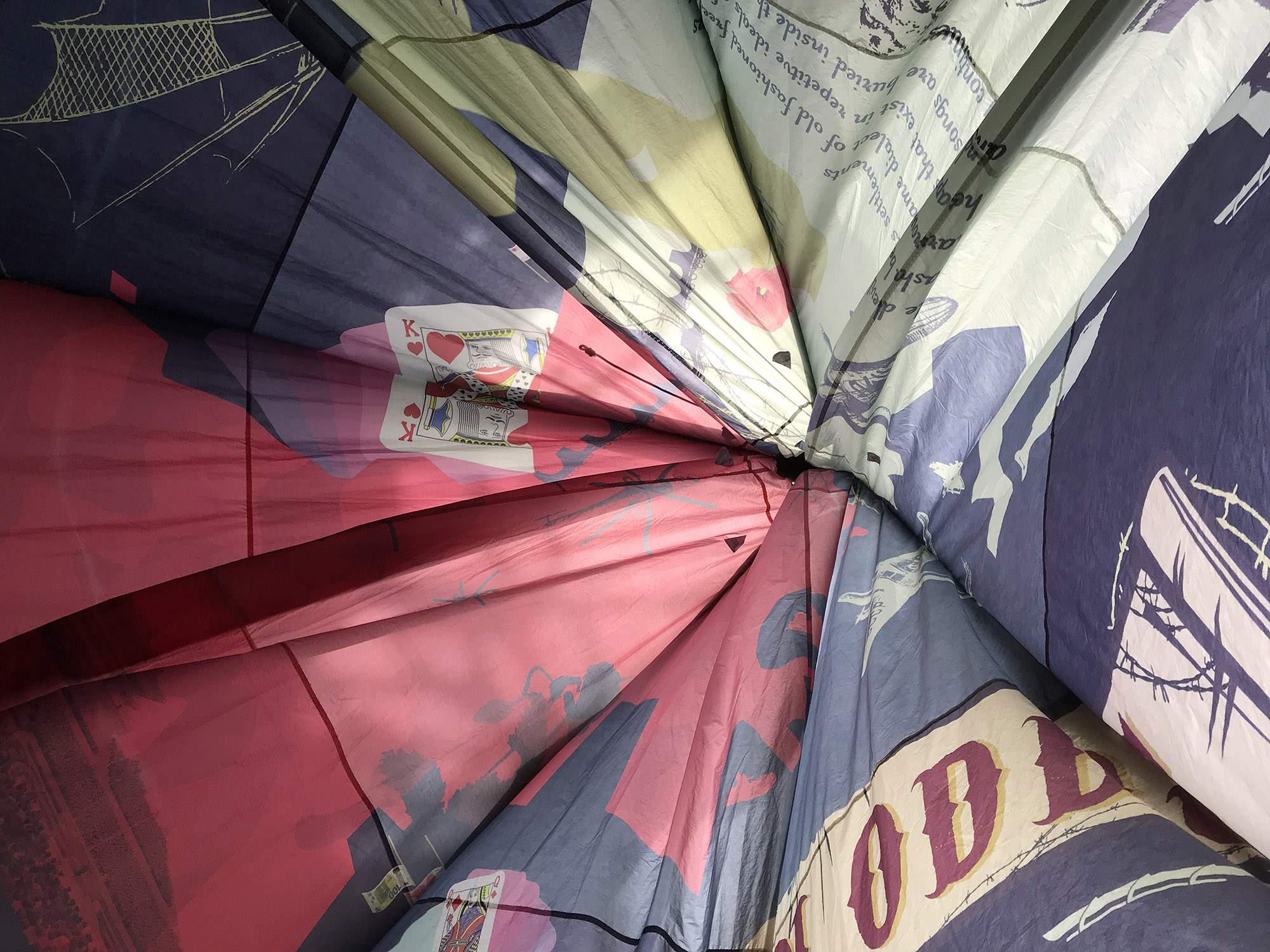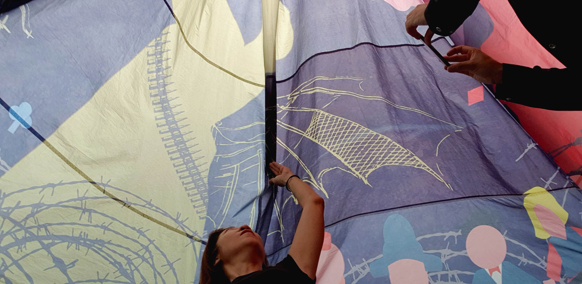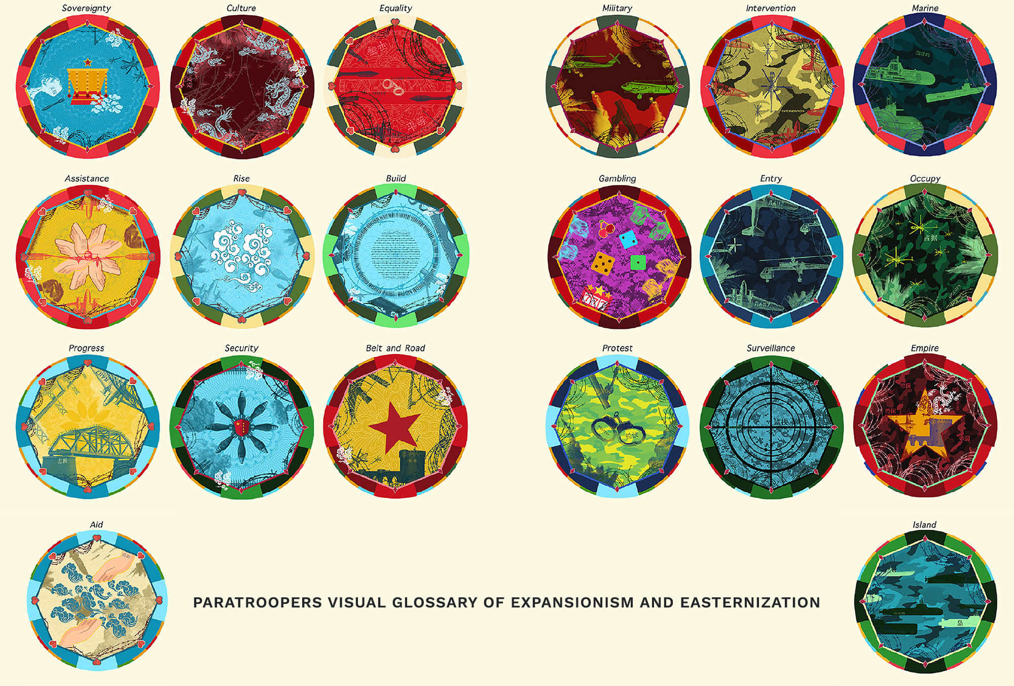 Key elements of Josephine’s DMZland—a life-size parachute made of actual parachute material, comprised of a collage of doll cut-outs referencing Disneyland’s It’s a Small World water-boat ride, icons of war and China’s penchant for gambling; framed panels made of left over parachute designs and a horde of red toy solider paratroopers—were reimagined and integrated into the High Wire, High Seas exhibition. The survival parachute transformed into a tent enclosing a pseudo military encampment with war paraphernalia scattered around the tent floor, nautical maps of the Spratly Islands and Scarborough Shoals. In one corner, is a television blaring a montage of news footage from news agencies such as ABS-CBN, GMA 7, 60mins, Aljazeera, and Channel News Asia intercut with political analysts talking about the BRI at the Center for Strategic and International Studies, and the Carnegie Council for International Affairs, and superimposed 3D animated humanoids, terracotta soldiers, gambling and military icons