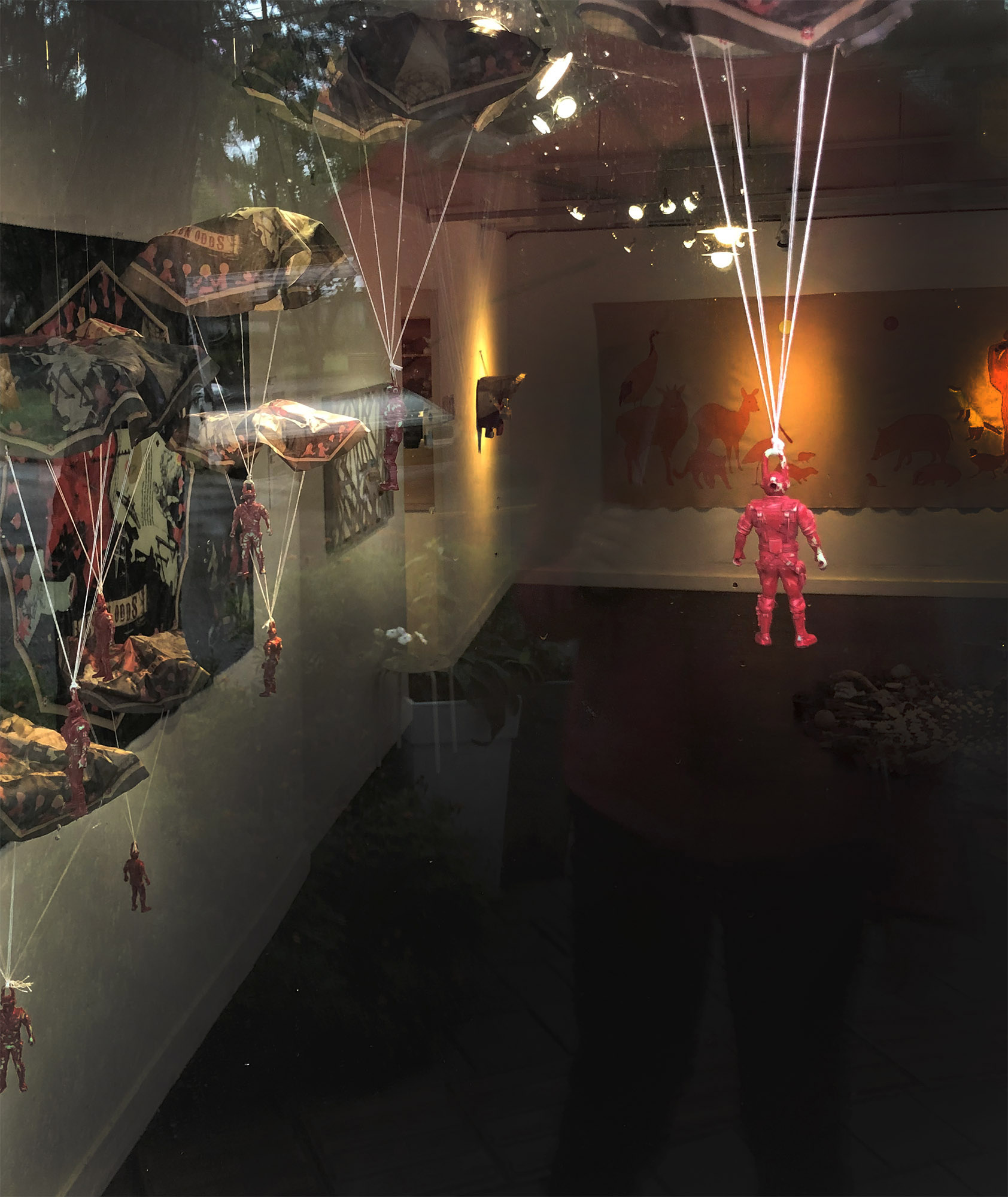 One hundred forty-five shiny red-painted army paratroopers swoop down from the gallery’s ceilings landing on the floor. Their colorful parachutes, made from a single discarded parachute, are imprinted with 10 positive and 10 negative designs. These photoshopped collages obtained from internet stock photos and illustrations of military planes, helicopters, submarines, barbed wire, playing cards, poker chips, dice, the Chinese dragon, camouflage, and other Chinese symbols are emblematic of China’s suspect “expansionism and Easternization” in the Philippines and the surrounding region. Single words like “culture”, “intervention”, “build”, and “occupy” are inscribed on some of the parachutes, punctuating what Josephine has identified as the various perspectives on China’s encroaching domination, not just in the Philippines, but around the world.