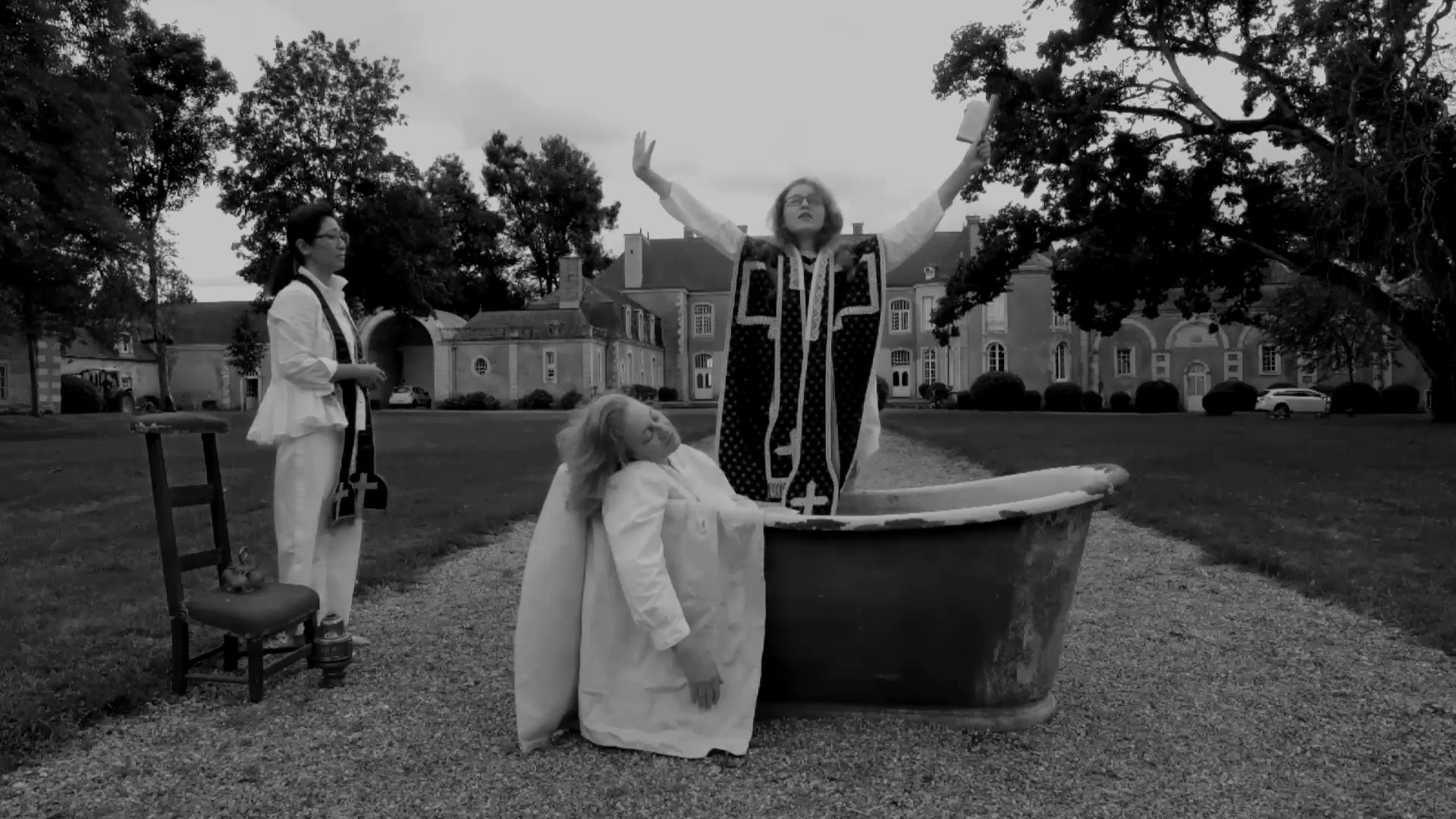 resurrectiō is a multi-media project consisting of a performance, sculptures, and a documentary video. Performed at the château’s front lawn, a blessing ritual, “pausok” in Filipino, consecrated the materials while re-enacting one of the most famous images of the French Revolution, Jacques-Louis David’s 1793 painting, The Death of Marat. One of the materials, a bathtub contains a figure that re-creates the scene of the murder of French revolutionary leader, Jean-Paul Marat. This attempts to connect with the marked grave on the castle grounds. The grave remembers the massacre of a general and his counter- revolutionary forces (approximately 300 people).