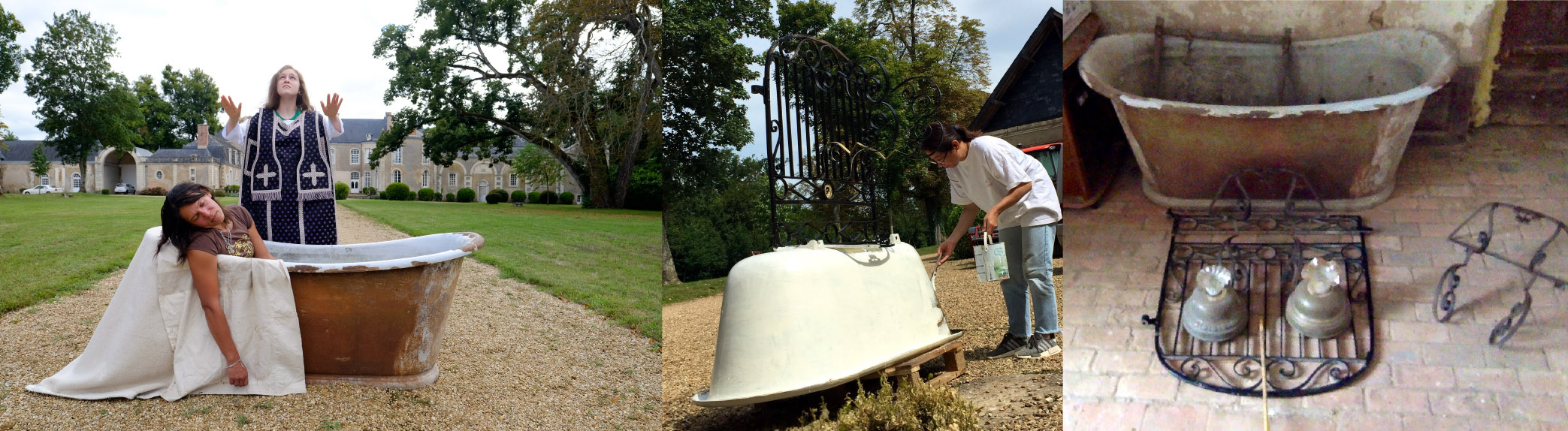 This project was conceived at the visual art residency as the first Philippine participant of the Fondation La Roche–Jacquelin in France. The residence took place in an 18th century château within a 60-hectare young forest in Le Departement de Maine et Loire, West of Paris, France. I was inspired to connect to the place and its history. Immediately my gaze was drawn to the chapel, commonly built as part of the household in many of these French châteaux. As I rummaged through some of the château and chapel’s old furniture, I chose to work with and re-use château detritus as materials: an old bathtub, old metal grills and glass lamp shades, desanctified ecclesiastical paraphernalia (bells, altar candles, bibles, missalettes), antique french provincial prie-dieu, and Catholic priests’ religious vestments, in an attempt to bridge religion and history with the elements present to me then.